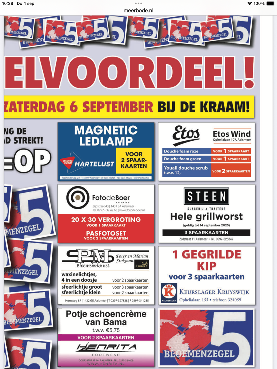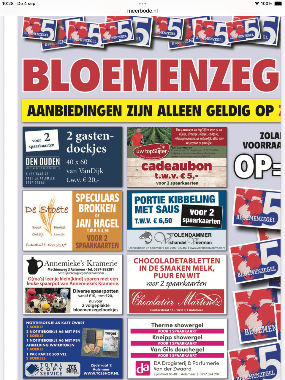 In de kraam in de Dorpsstraat kunt u met uw volle spaarkaarten allerlei leuke aanbiedingen van de Bloemenzegelwinkeliers aanschaffen. Voor een aantal producten (bijv. kip en vis) ontvangt u een waardebon waarmee u het product bij de desbetreffende winkel kan afhalen.